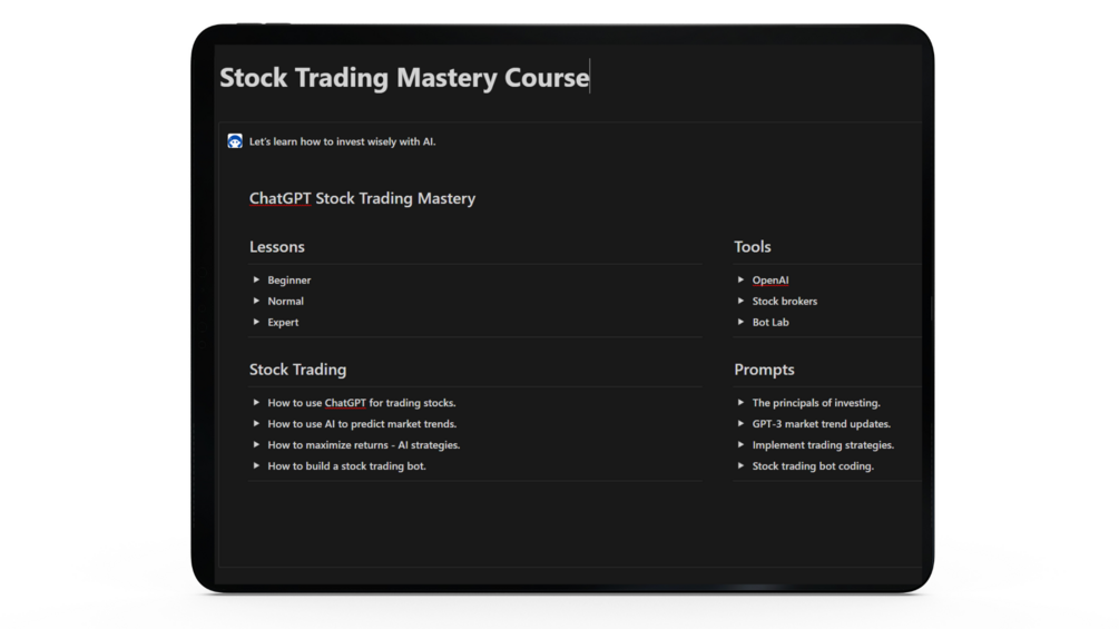 This course will teach you the basics of ChatGPT and stock investing, effective trading strategies, how to build AI trading bots and everything in between.
